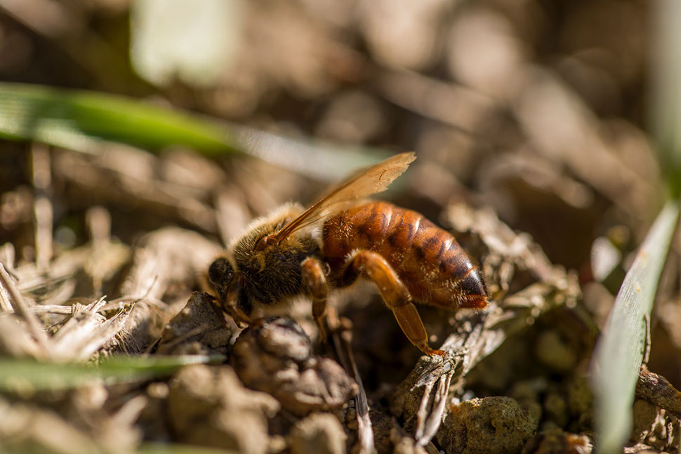 |越冬後一回目の内検が終わろうとしていた時、川代さんが卵を産んでいない群を見つけた。川代さんは、すかさず女王蜂を探し指で潰してしまった。このまま放置すれば、この群は消滅への道を辿ることになってしまうのだ。翌朝、この巣箱を見ると、蜂が落ち着きなく巣門の外で飛び回っている。女王蜂が居なくなって混乱しているのだ。巣箱の近くを探すと、昨日死んだ女王蜂が巣箱から外に運び出されていた。
