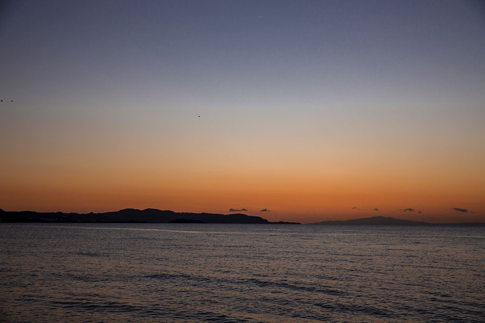 館山湾に強風が吹き荒れた翌日は、穏やかな日没となった。洲崎岬の先に伊豆半島が望める
