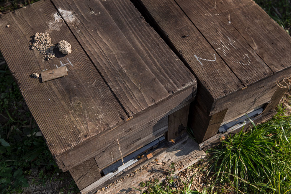 |「蜂に餌をやるとね、蜂が汗をかいて、巣箱が湿気を持つから。それで、箱の周囲に隙間を作って湿気を逃してやると良いんじゃないかと思ってね」