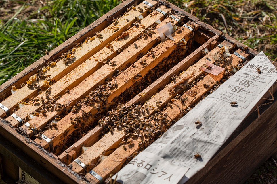|川代さんは、蜂の健康に対して細かい気遣いをしている。冬を越して初めての内検は、餌の不足を補うのが主な目的だ。