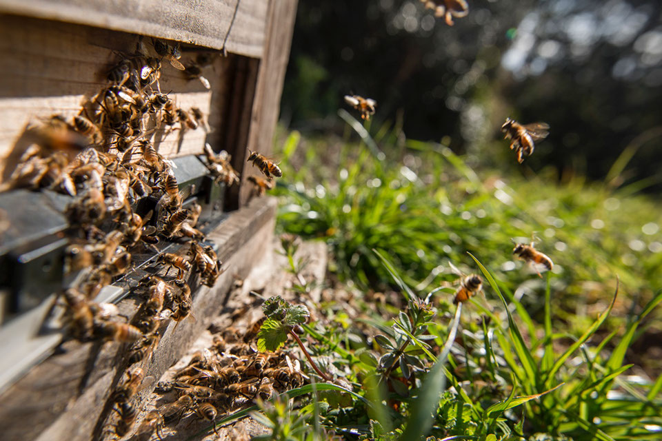 2つの群を合同したばかりの巣箱。蜜蜂が落ち着かず、しばらくは乱れ飛ぶ