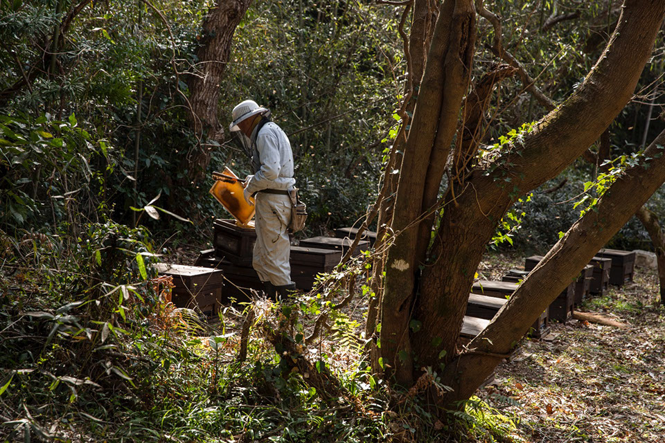 南房総市池之内の養蜂場で蜜の溜まった巣板を入れようとする川代さん。木々に囲まれたこの養蜂場は風の影響が少ない