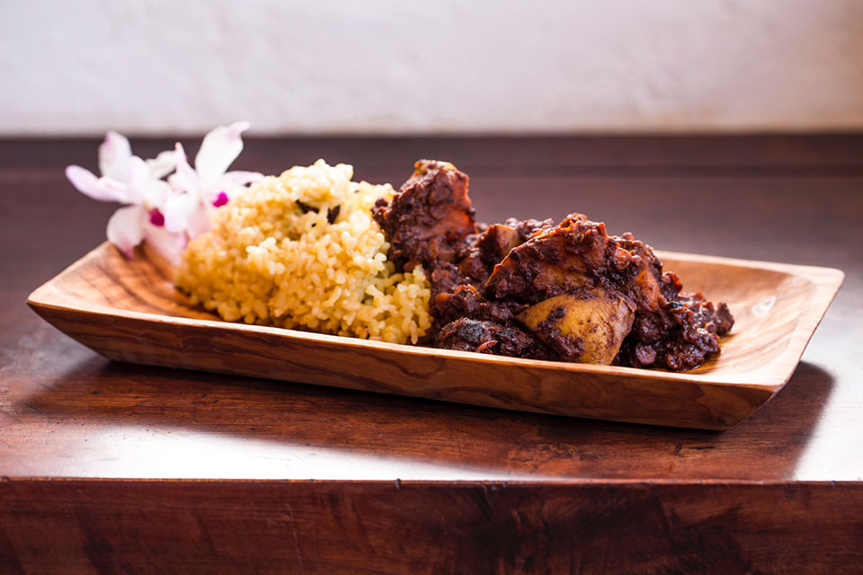 木の皿に盛り付けられた玄米のサフランライスとアーユルヴェーダ・ダルカレー