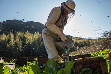 |日射しは暖かいが春嵐ともいえる南からの強い風の吹く日だった。気温は上がらず巣箱に吹き付ける強風の音が、蜜蜂たちを不安に陥れていたのかも知れない。内検をする川代さんの背中にしがみつくように止まっている数匹の蜜蜂の姿を見て、気性が荒いということは、人懐っこい感情の裏返しなのかなと思っていた。