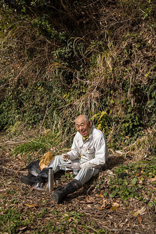 内検にひと区切りを付けて近くの陽だまりでラジオを聞きながら昼食をとる