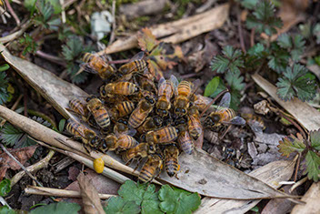 |確かに、巣門の辺りを見ると、内検で巣箱の蓋を開けた時、一斉に飛び出した蜜蜂たちが、寒さのために巣箱まで帰ってこられないで、数匹の蜂が巣門手前の草むらの中で蜂団子の状態になっていた。互いの体温で温め合っているのだ。寒くて、体が動かず、残りわずか数十センチの距離さえ帰れなくなっているようだ。このまま凍えて死んでしまう可能性もある過酷さである。