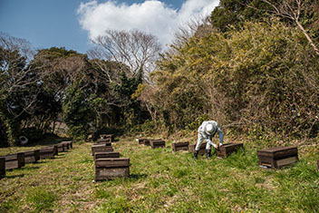 |今、館山にいる川代養蜂場の蜜蜂たちの本拠地は、青森県八戸市だ。蜜蜂に冬を越させるため、温暖な房総半島の千葉県館山市で昨年12月初めから転飼し、越冬した蜜蜂の状態を2月上旬に内検する。蜜蜂が冬の間に食べてしまった食料(花粉や蜂蜜)を補給するため、人工の花粉や砂糖水を与えるのが、この日、川代さんが行っている作業だ。