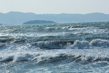 強風のために仕事を中断した日の午後は、館山湾も大荒れだった