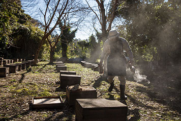 南房総市池之内の養蜂場は木立に囲まれ比較的に風も当たらない。燻煙器を持って越冬した蜜蜂の内検をする朝