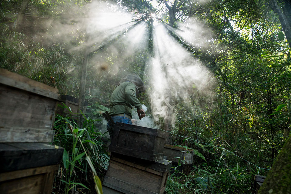 星高養蜂場は周りを木立で囲まれている。正さんが使う燻煙器の煙が木漏れ日に輝き幻想的な光景を浮かび上がらせる