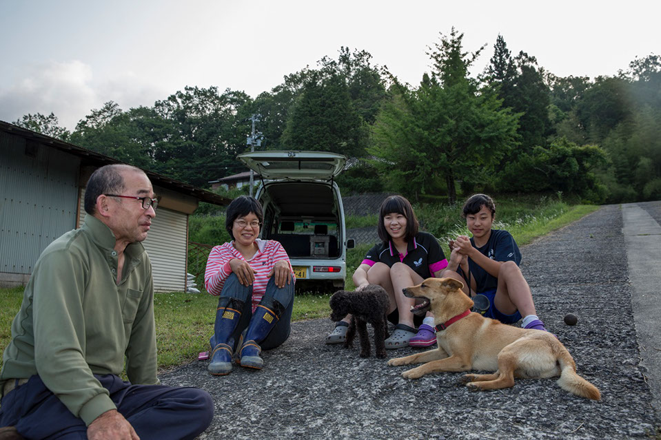 |連日の早朝起きと重労働で、この日の作業が終わる頃になると、皆が少々疲れ気味だ。正さんが蜜の入った巣箱を腰に担いで養蜂場の外に出ると、ゆき子さんが軽トラックの荷台に座ってぼんやりしていた。