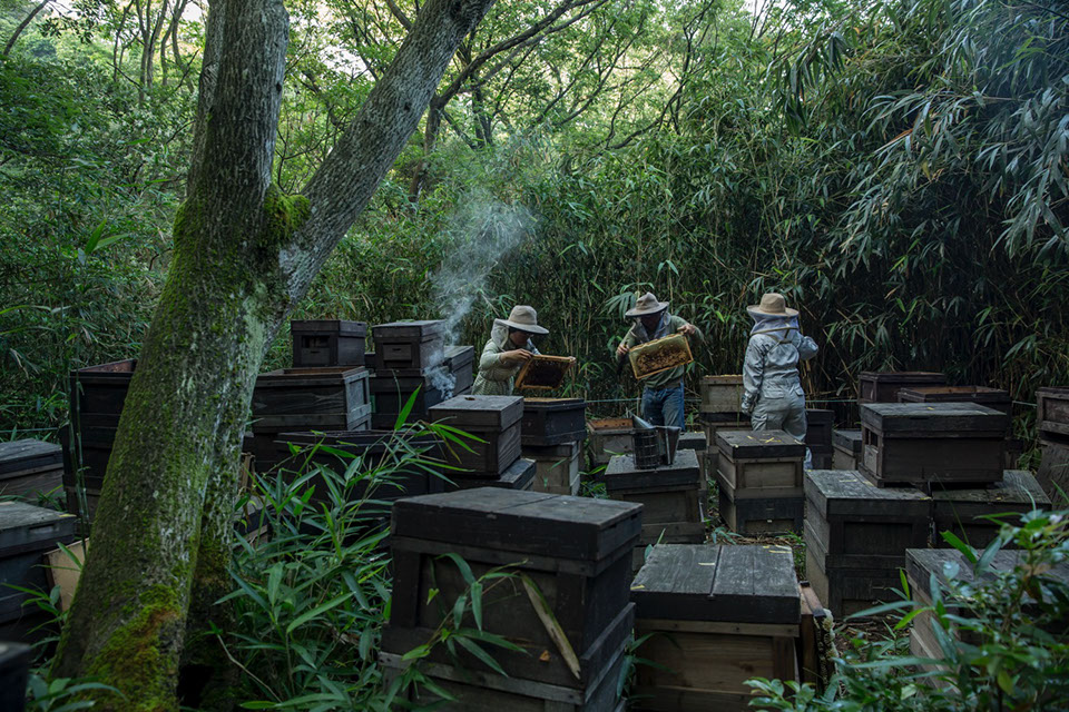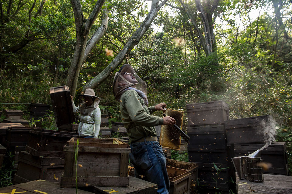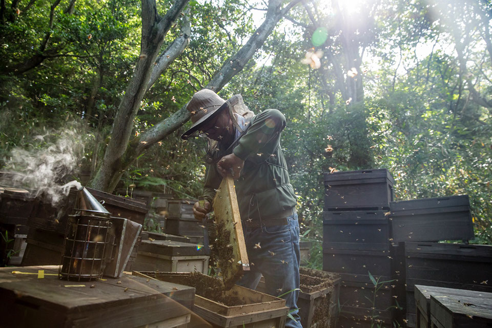 |ベタ板が出たことで勢いが一層増したのか、巣箱から巣枠を取り出す正さんの動作がリズミカルだ。「星高」と呼ぶこの養蜂場は、周りを林に囲まれ周辺の状況はまったく見えない。遠心分離器と蜜蓋切り作業は養蜂場の外で行うため、狭い通路を蜂蜜の入った巣箱を腰に乗せて運び出さなければならない。
