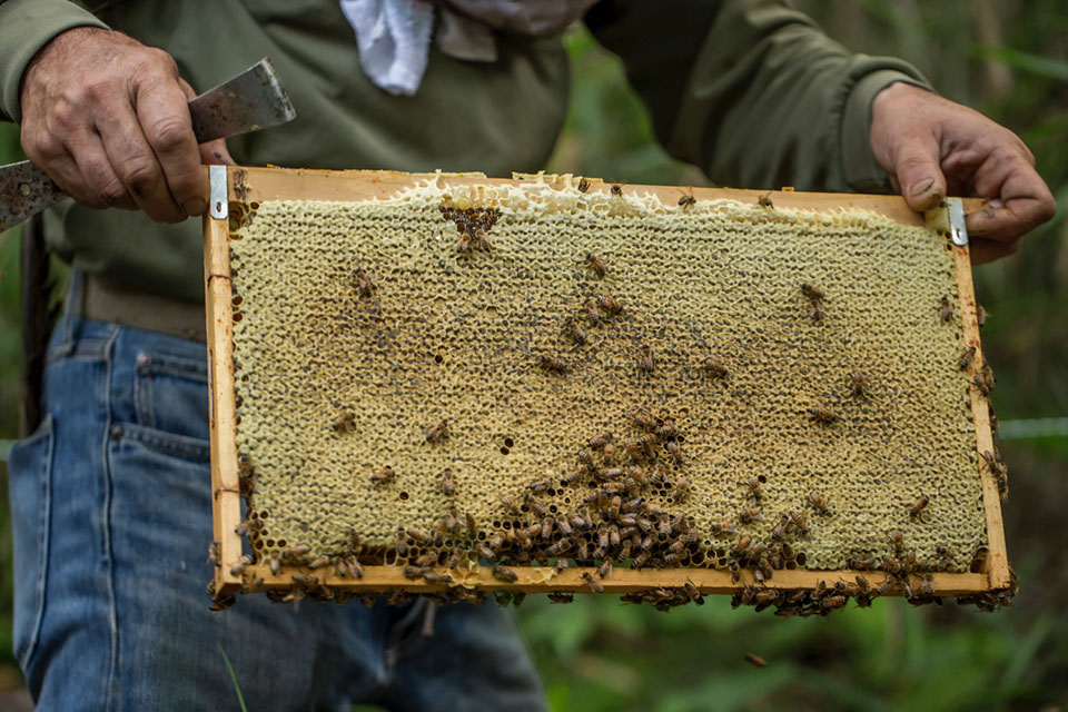 星高養蜂場で採蜜のために巣枠を取り出す中山正さん。周りを囲む木立の上から陽が差し込み始めると蜜蜂の動きが活発になってきた