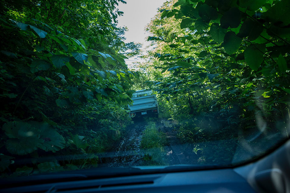 国道から入り込んだ国有林の狭い林道を縫うように走って「ため池の奥」養蜂場に向かう