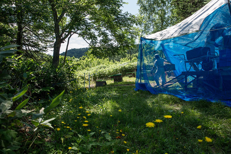 巣箱が並ぶ森の一角。サーカス小屋のような青いカヤの中で採蜜作業が行われる