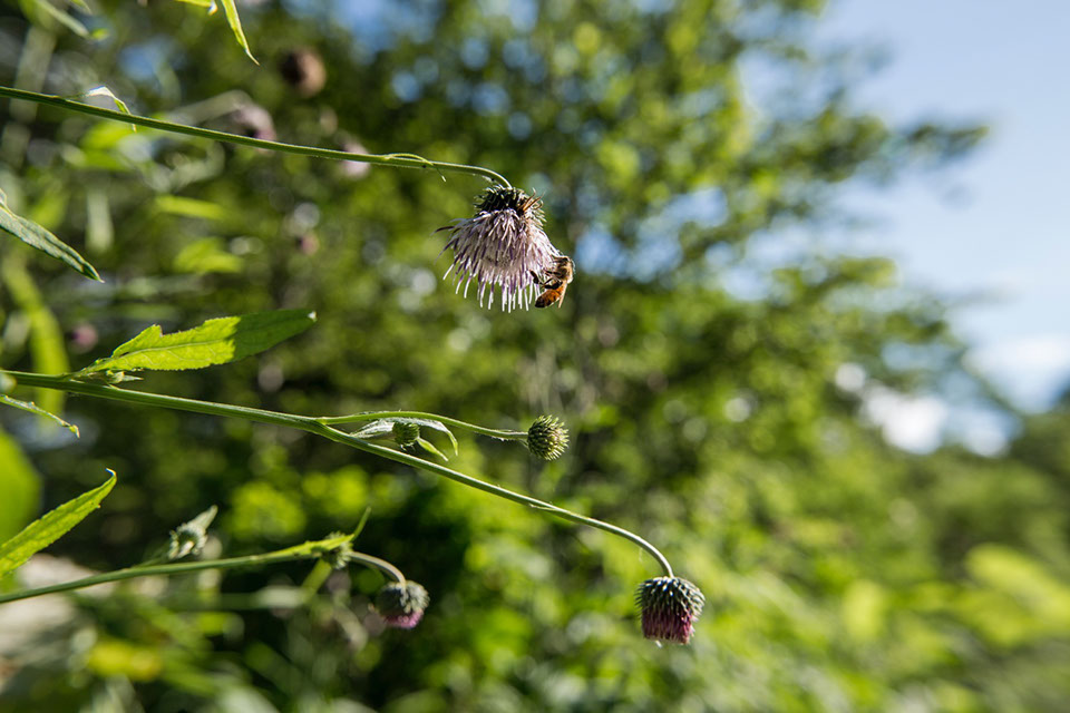 アザミの花に寄った蜜蜂。北海道のアザミは背丈が約2メートルまで伸び、一本のアザミに100個ほども花を付ける