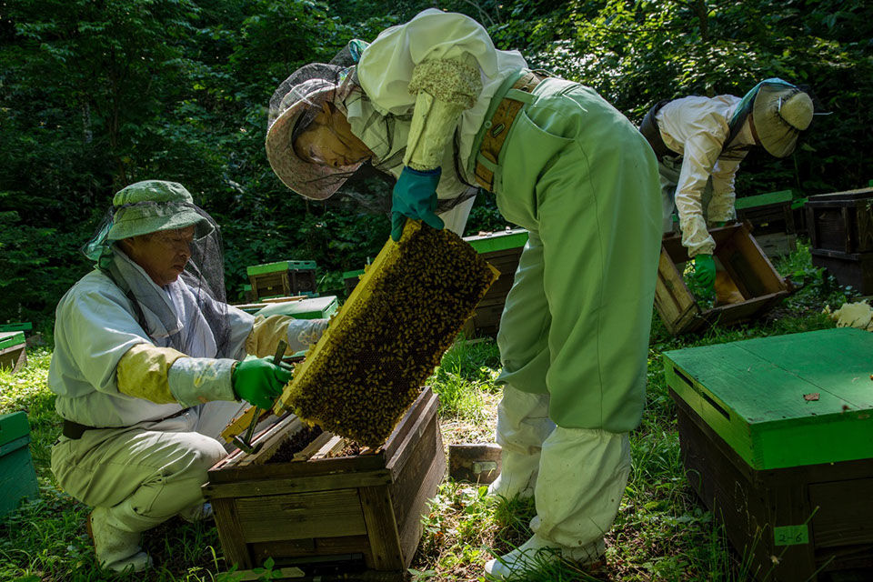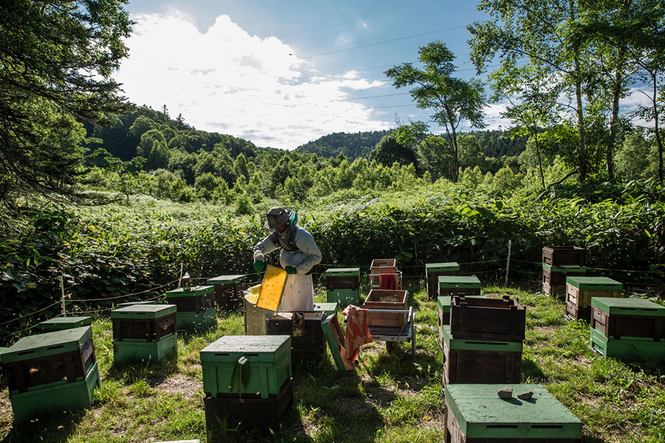 「蜂屋なんて絶対やらないと思ってましたね。父の時代には、ただ、蜜が溜まるのを待って、蜂蜜だけで生活してましたから大変でしたね。蜜の値段も安かったですから。今は果物などの交配のための蜂が求められ、蜂の数を増やして仕事は大変になったけど、経済的には昔に比べれば楽になってきてます」