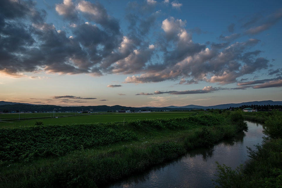 周市さんの自宅近くを流れるタヨロマ川の夕暮れ。しばらくして稲の花が咲き始めたら農薬の空中散布が始まる