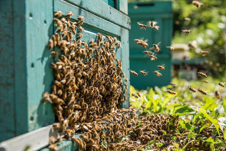 活発に巣箱に出入りする蜜蜂たち。そんな様子の蜜蜂を見て、忠則さんが「働きなよ」と声を掛ける