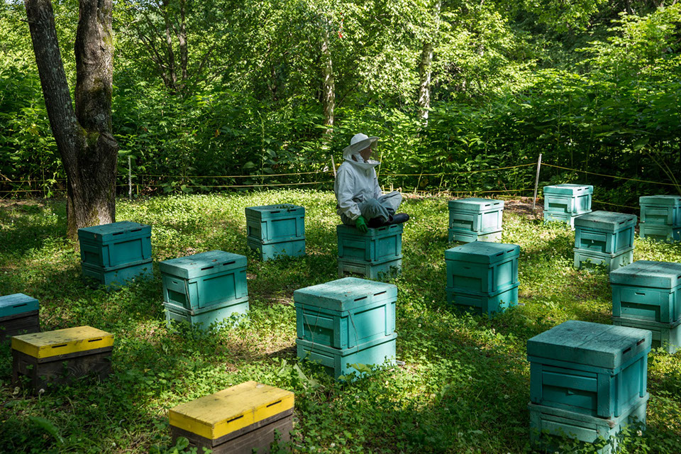 2トントラックで昨日採蜜した日進九線蜂場前の林道を通ると、蜜蜂が勢いよく飛び交っているのが見えた。「働きなよ」と、忠則さんがハンドルを握ったまま愛おしさを込めて声をかける。採蜜の時に遠心分離器から漂ってきた青シナの蜂蜜の芳醇な香りを思い出した。