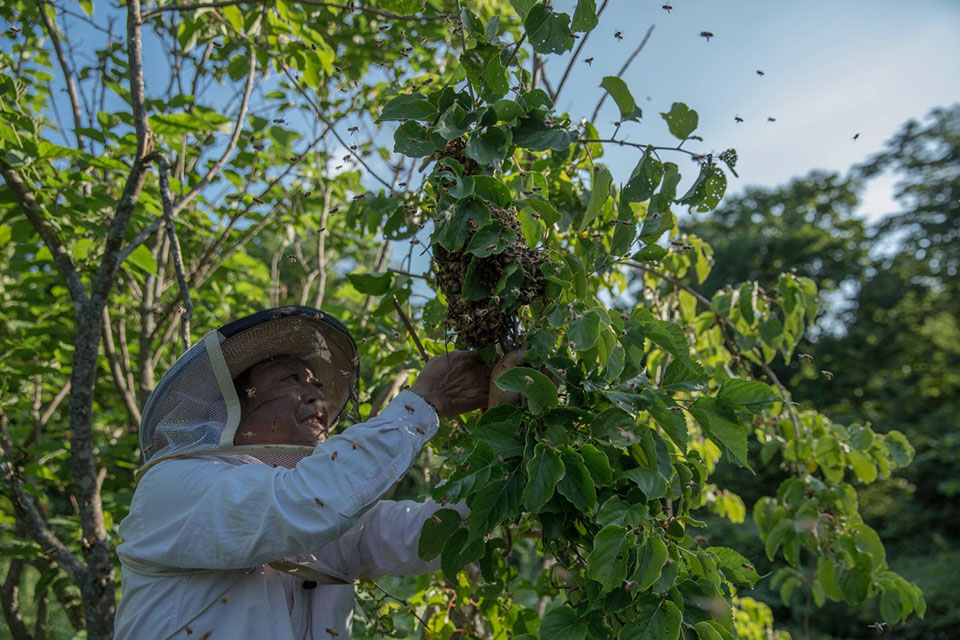 「若い時は、家の中の子どもの飼育とか、家の中の掃除とかする内勤蜂と言うんですけど。ある程度歳を取ると、外へ出て働く外勤蜂っていうのがあるんです。外勤蜂が蜜を採りに出て、内勤の蜂に口移しで蜜を渡して溜めていくんですね。巣箱を触っていても、怒ってくるのは一番年寄りの蜂。経験が豊富なちゅうたらええか、まあ、怒り出したら一斉にお尻を跳ね上げて、蜂毒のとこから液出しもって怒るんですけどもね。刺してしまったら自分の生命っていうのは無くなるんですから。年寄りの蜂は、それを知ってて、仲間を守るために身を挺して襲ってくるんですからね」