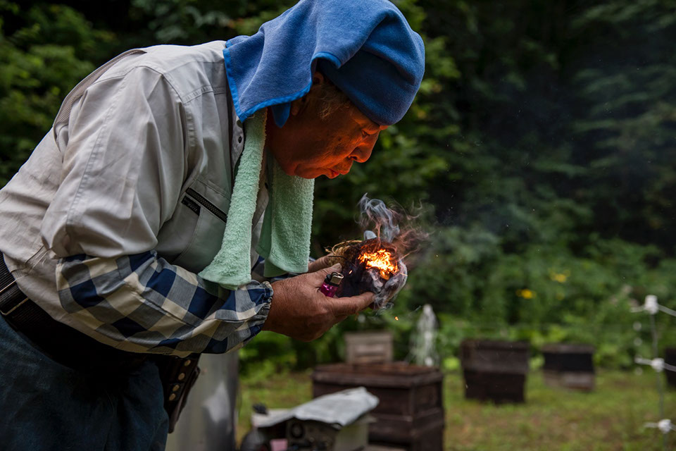 まだ薄暗い早朝、蜂場に到着して最初に熊避け電柵の電源を切った後、燻煙器の火種にするドンゴロスに火を点ける今城欣一さん