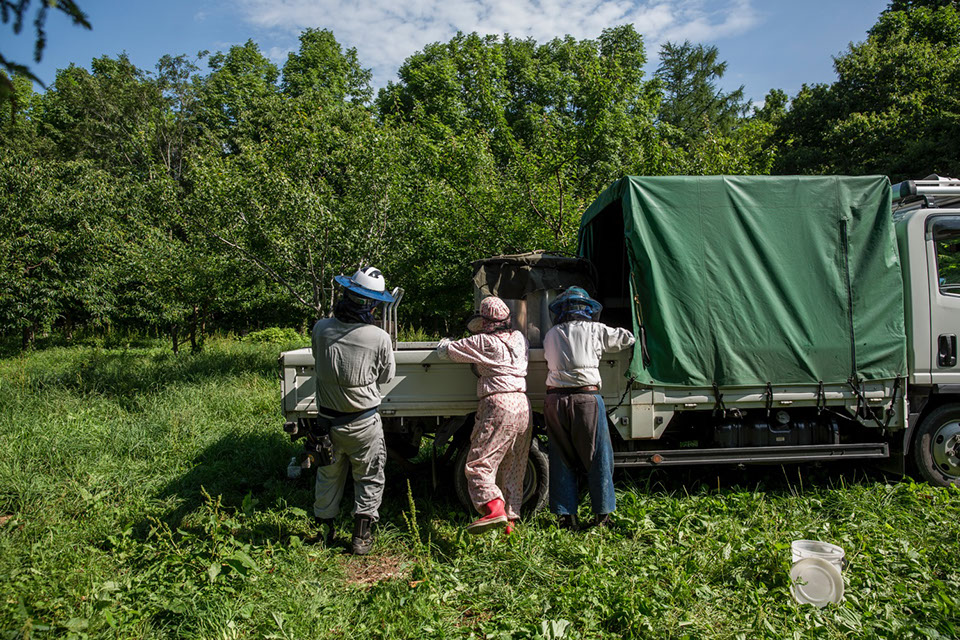採蜜の道具をトラックの荷台に載せ終えた今城欣一さんたち家族。後ろ姿にも家族の絆の太さが表れてくる