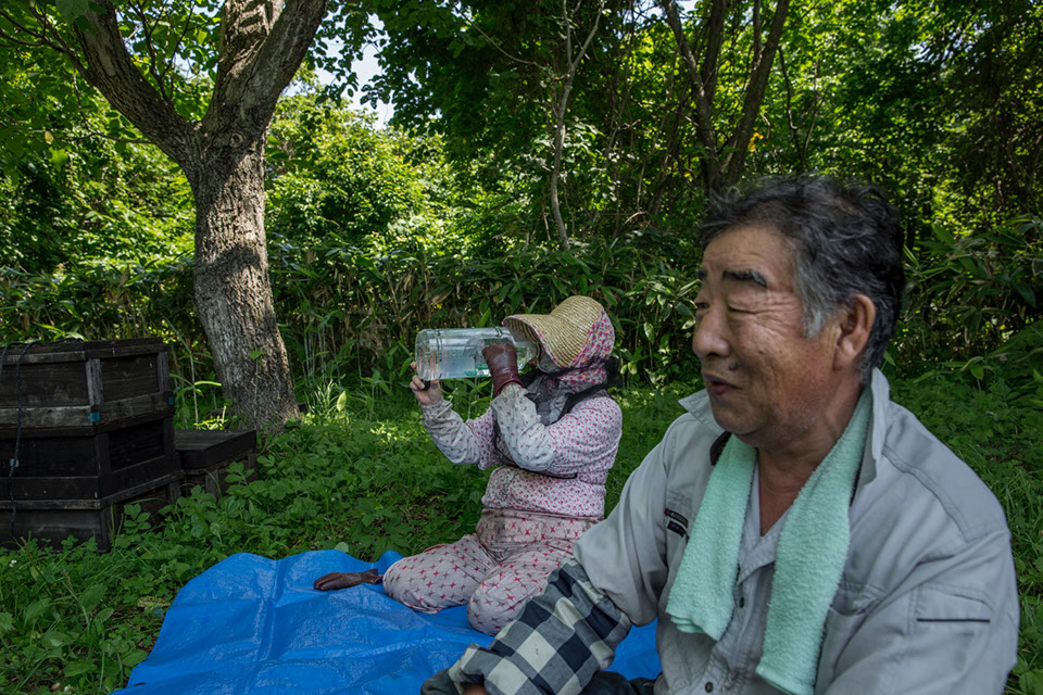|ここで一雄さんは、「ぼく、別の仕事があるから」と帰って行った。欣一さんと美津子さんは、採蜜作業を始める前にブルーシートを広げて小休止。欣一さんが2リットル入りペットボトルの水をゴクゴクと息も付かずに飲む。そのペットボトルを受け取った美津子さんも、ゴクゴクと一気に飲んでいる。「2人で3リットルは飲みますね」。