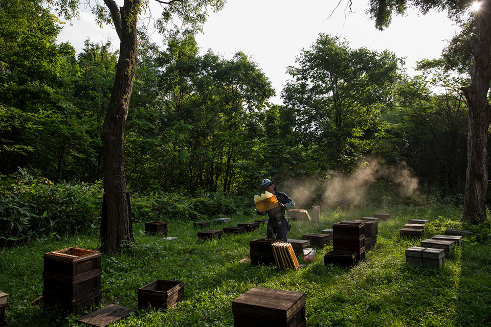 |午前8時30分過ぎには、沖里河蜂場の採蜜が終わった。。休憩することもなく次の豊泉閣蜂場へ向かう。