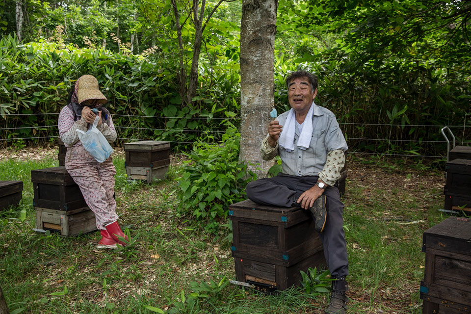 |現場に到着すると、熊避け電柵の電源を切ることから仕事が始まる。「熊が一度付いたら、もう離れません」と欣一さんが言う。北海道の養蜂家は、熊対策に細心の注意を払わなければならないのだ。