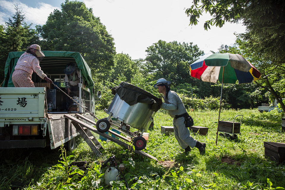 |2トントラックの荷台から足場板2枚を斜めに架け、その上を滑らせるように、遠心分離器を注意深く降ろし設置する。近くに巣箱を並べ、蜜蓋を切る場所を整え、機能的な採蜜工場を造るように作業場を組み立てる。準備が万端整った頃に長男の一雄(かずお)さん(41)が到着した。