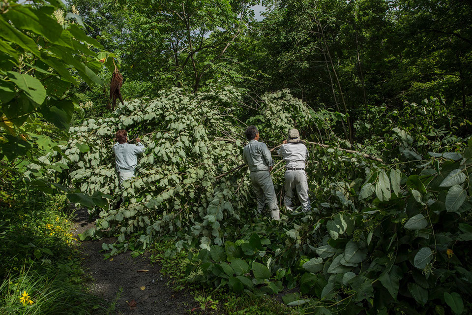 数日前の台風の影響で大きな樹が倒れ込み、芳野蜂場へ続く林道を塞いでしまったため皆で取り除く