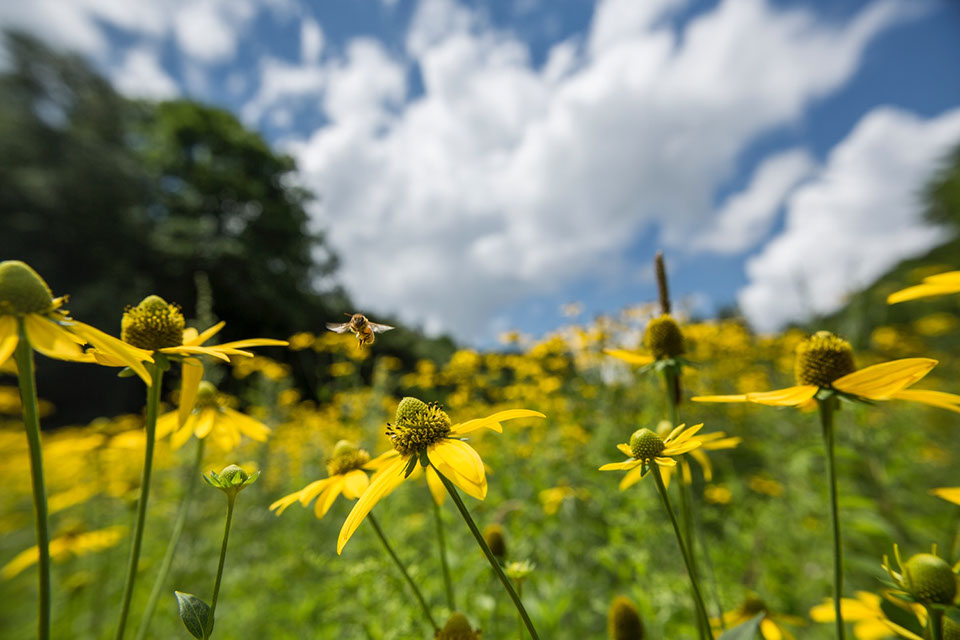 芳野蜂場の近くで満開だったオオハンゴンソウに寄る蜜蜂