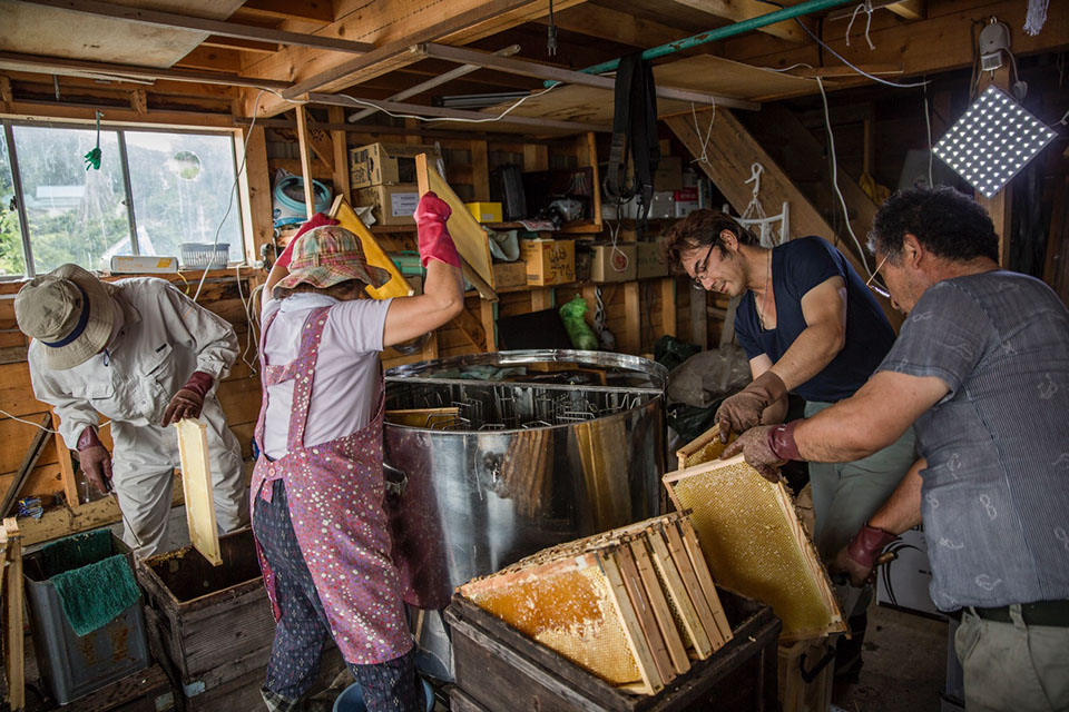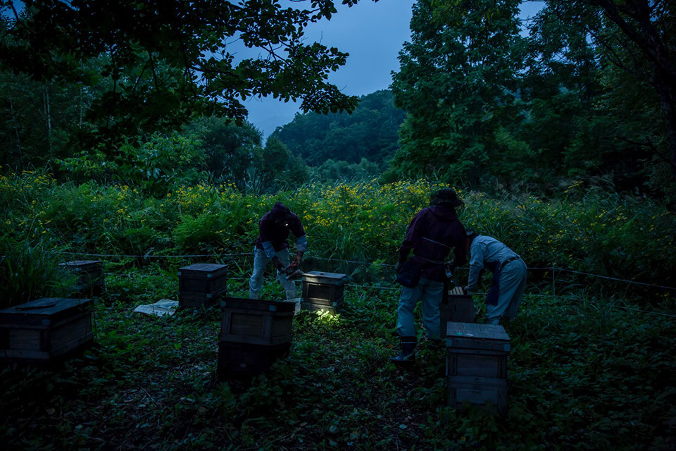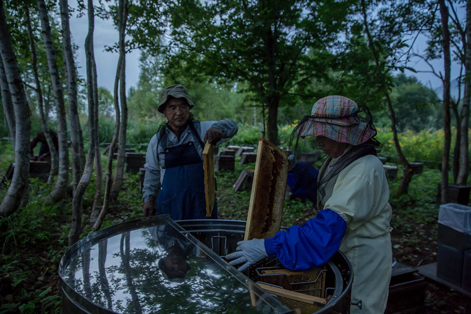 |丹美さんが巣枠を遠心分離器に入れる音に続いて、モーターの回る音がひんやりした空気の中に伝わってくる。康幸さんと祥介さんが巣枠を運び、蜜蓋を切ると斜めにして巣箱に並べていく。丹美さんが遠心分離器にセットし、絞り終わった巣枠を取り出す。遠心分離器で絞った蜜を受けたポリバケツから一斗缶へ移すために漉し器へ入れた蜂蜜が数滴こぼれた。丹美さんは、丁寧に指先で掬い取り、漉し器の布に擦りつけた。「一滴の蜂蜜も無駄にしない」という丹美さんの意志が伝わってくる。絞り終わった巣枠の巣房を整えて祥介さんが巣箱へ戻しにいく。下村さんは、巣箱を点検し巣枠を運び出すための準備をしていた。誰もが手を休める時間がないほどに、合理的な流れ作業だ。