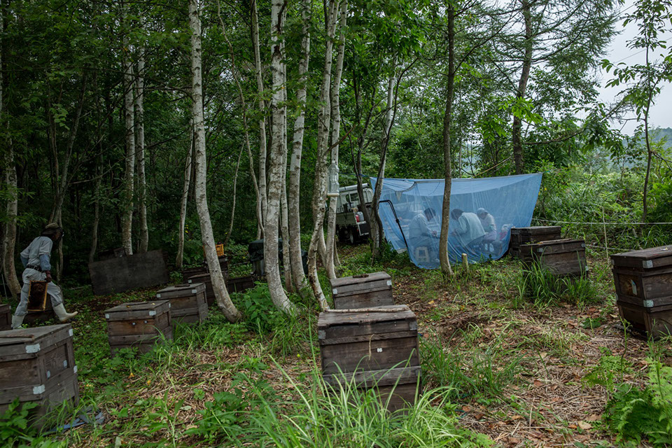 西里2蜂場では近くの木立を利用して蚊帳を張り、ローヤルゼリー採取を行っている