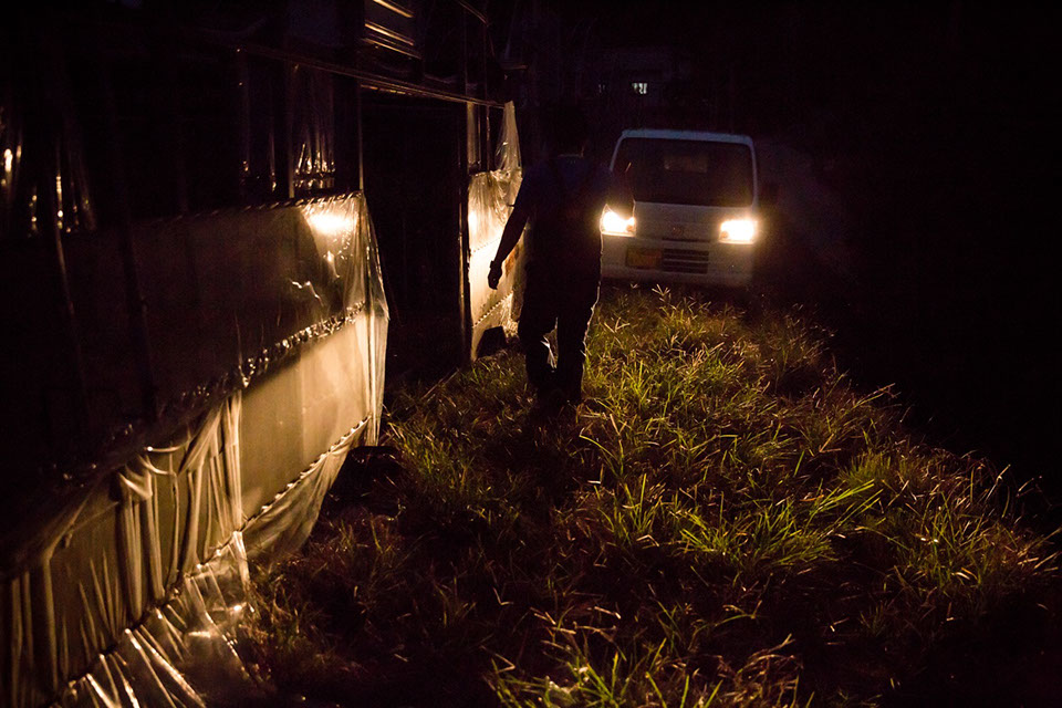 日暮れてから南島原市加津佐町のイチゴハウスに交配用の蜜蜂を配達し設置までする幸一さん