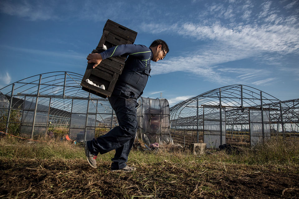 JA福岡大川支所のイチゴ農家からの注文で、幸一さんが交配用の蜜蜂を設置場所へ運ぶ