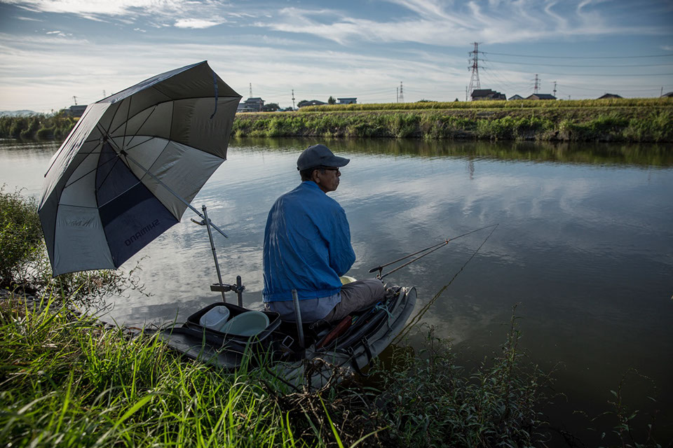 幸一さんが交配用の蜜蜂を運んでいるすぐ背後の川で、ヘラブナ釣りをしていた釣り人