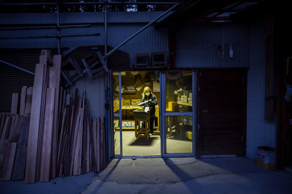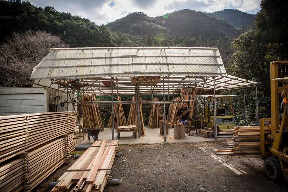 長谷川養蜂木工部は山に囲まれた小さな盆地にある。屋外の製材所で材料を揃える