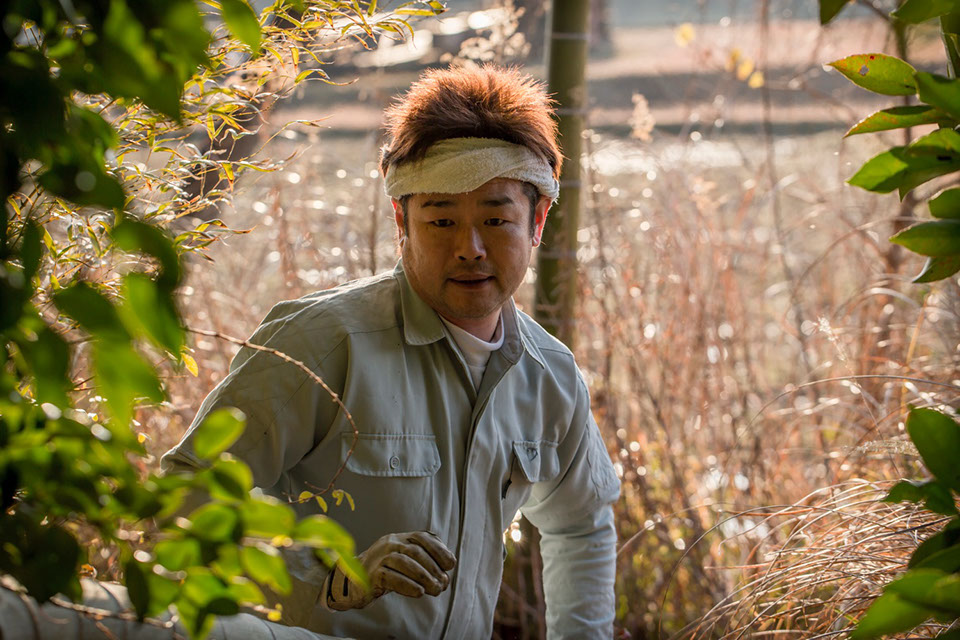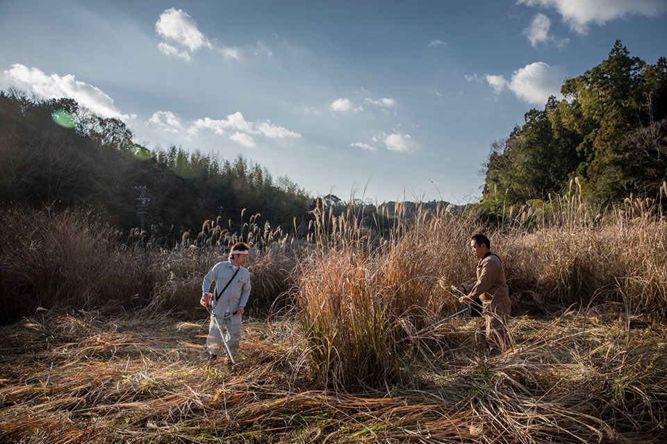 翌朝は、北海道の羽佐田康幸さん(「羽音に聴く」16号参照)が、越冬のために近くに蜜蜂を移動してくるというので巣箱を置く場所の整地に出掛けた。羽佐田さんは、洋さんが実質的に養蜂の技術を教えてもらい、北海道へ採蜜に行く時には面倒を見て貰っている深い絆で結ばれた養蜂家の仲間だ。洋さんと山本さんの2人で、一年の間に成長した孟宗竹を切り倒し、伸びたカヤを草刈り機でなぎ倒していく。雑草の伸びていた荒れ地が見る見るうちに蜂場の空間に様変わりしていく。