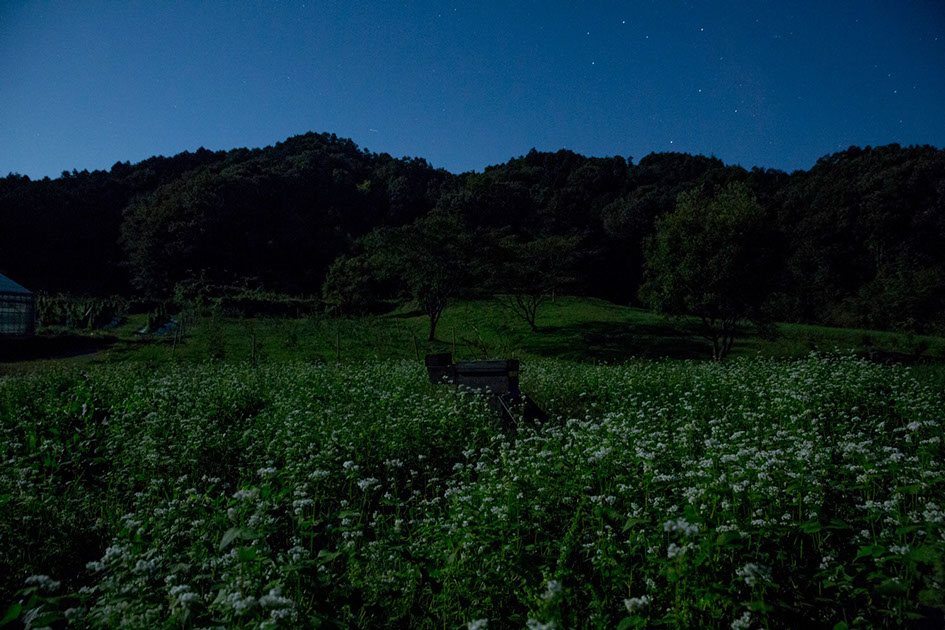 満月の月明かりの下で、ソバの花の中にぽつりと置かれた巣箱を撮影していると、一旦帰宅した加藤さんが、私の夕食のためにと弁当を持ってきてくれた。月明かりに照らし出された巣箱を二人で眺めている時、加藤さんが昼間言い忘れたことを思い出したように呟いた。