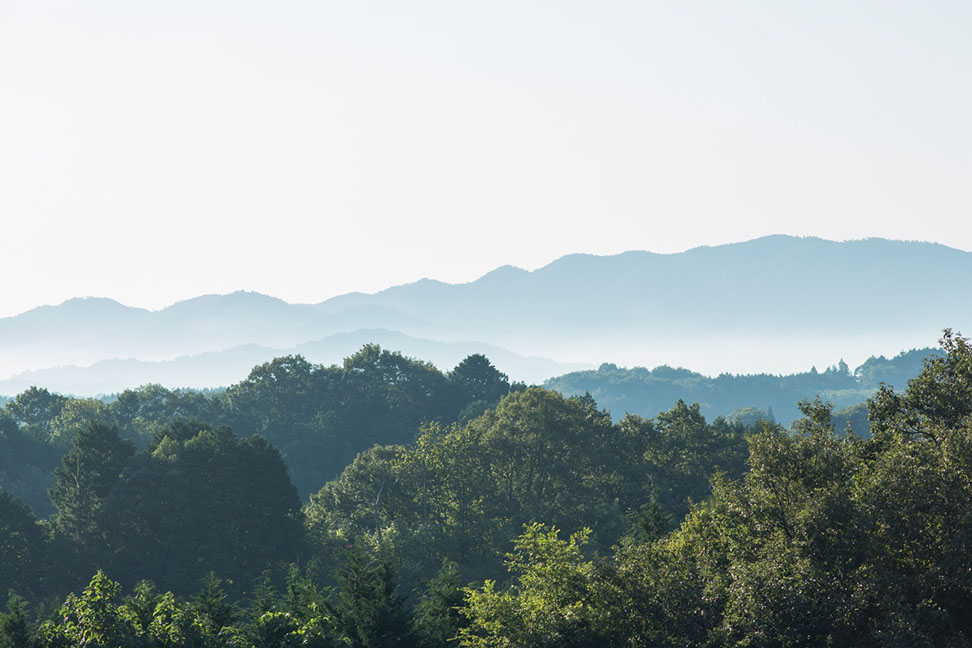 早朝に奥津ダム湖辺りから鏡野町の山々を望む