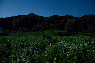 満月の月明かりの下で、ソバの花の中にぽつりと置かれた巣箱を撮影していると、一旦帰宅した加藤さんが、私の夕食のためにと弁当を持ってきてくれた。月明かりに照らし出された巣箱を二人で眺めている時、加藤さんが昼間言い忘れたことを思い出したように呟いた。