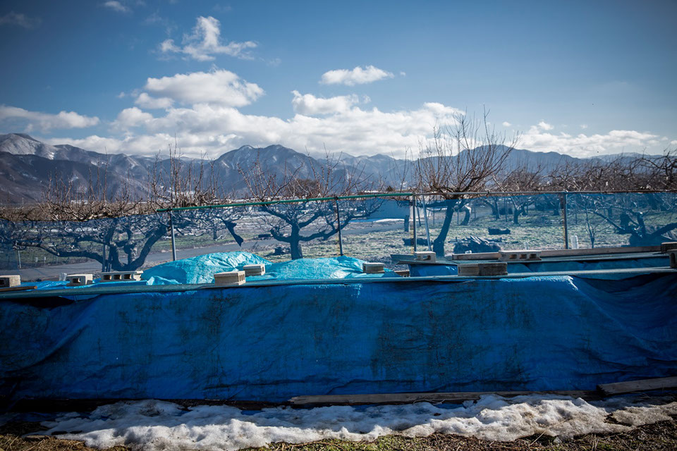 りんご畑に隣接する柳原蜂場は境に青いネットを張って、蜜蜂が低空を飛ばないように