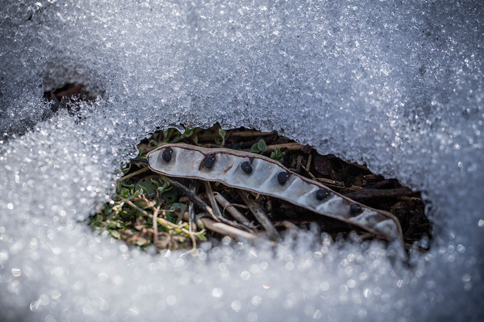 初夏にアカシア蜜を採る千曲川河川敷の蜂場を訪ねると、一面の雪に覆われていた。しかし、雪の上に落ちた実の周辺だけは雪が溶け春が間近であることを告げている