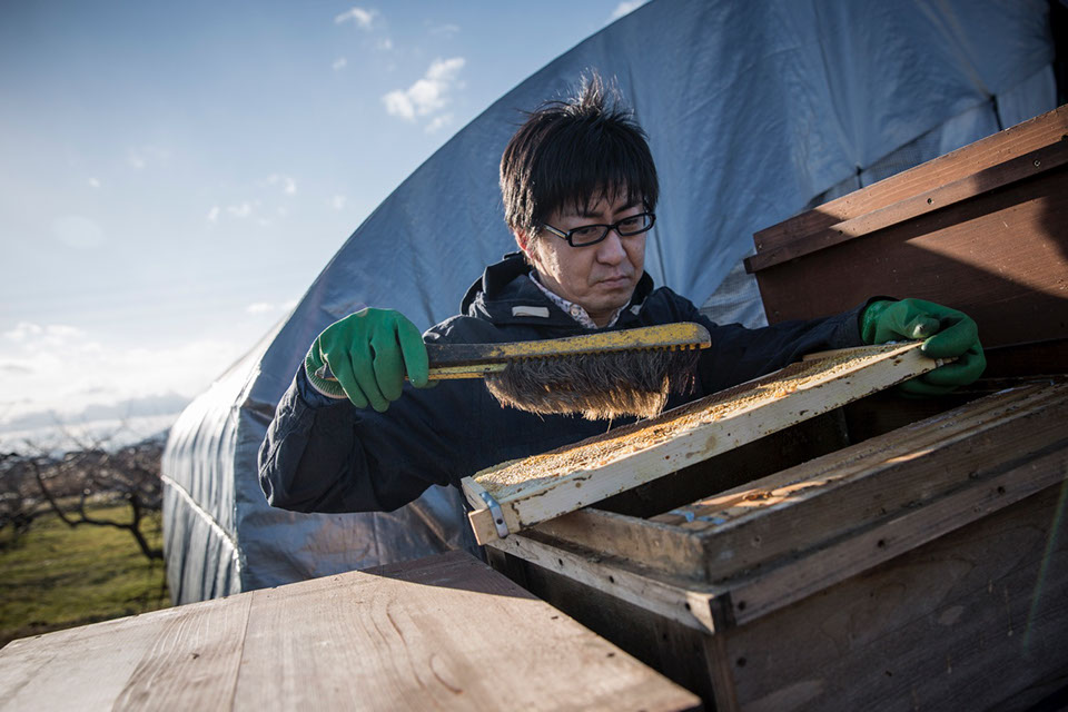 「養蜂家というのは、だいたいお祖父ちゃんや父親がやっているのを見て、そっから継ぐというのがオーソドックスな継承だと思うんですよ。ぼくの場合は地盤も何にも無いんですけど、自分の蜂蜜をブランド化して売りたいという思いがあったんです。蜂に興味を持ったのは、父が蜜蜂を飼っていたというのはもちろんですが、まだ東京で仕事をしていた時、銀座ミツバチプロジェクトの見学会に参加して、都会のビルの屋上でも年間1トン近く蜂蜜が採れるのを知ったことですね。うちのブランド名は『なごみつ』というんですけど、細かいところから積み上げてブランドを定着させ、首都圏、全国展開で売っていく戦略というか、急には無理なんで少しずつですね。売りっぱなしというのは良くないと思うんですよ。売った後、どう使うかとか、例えばアカシア蜂蜜はどういう料理に合うとか、百花蜜はこの料理に合うとか、蜂蜜の種類も色々ありますので、そういうところまで提案して使って頂き、消費を伸ばしていくのが、うちの養蜂場の仕事の進め方と、ぼくは思っているんです。代々養蜂をやってこられた方とは、考え方が違うと思います。ぼくは、広告とかプロモーションとかマーケティングとか、そっちの方から考えるんで……。一般的に養蜂家の方は、たぶん養蜂の技術とか、そっちの方から考えると思うんですね」
