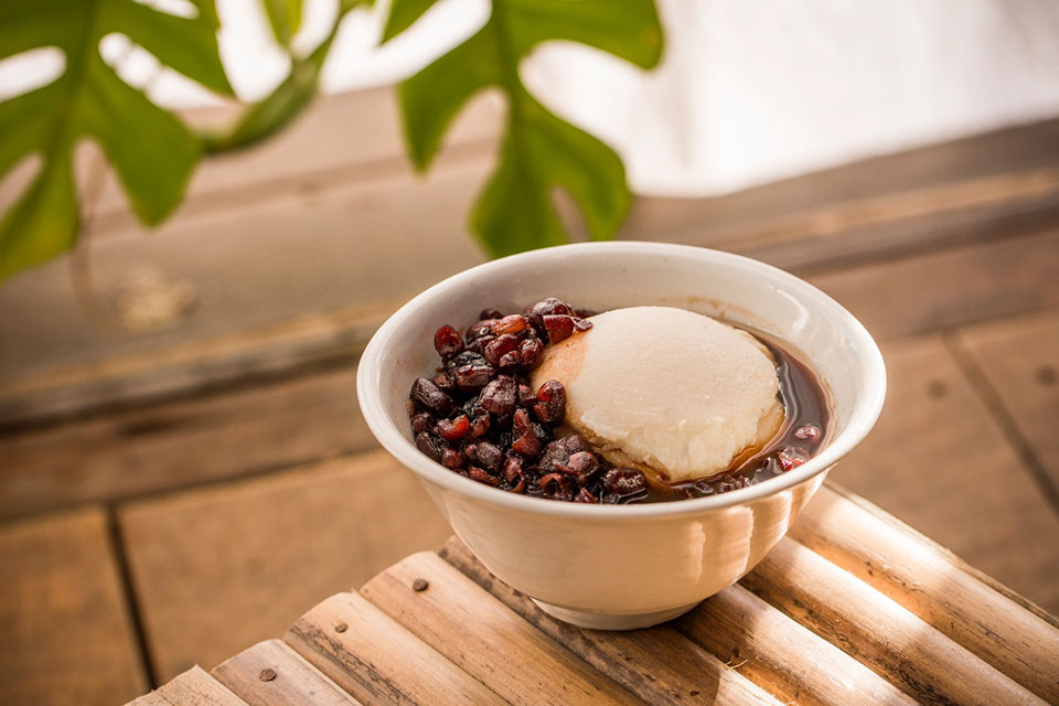 固まったココナッツミルク豆腐を冷蔵ケースから取り出し、大さじで掬い取って器に盛ると、まだ湯気の立っている煮小豆を上から掛けた。