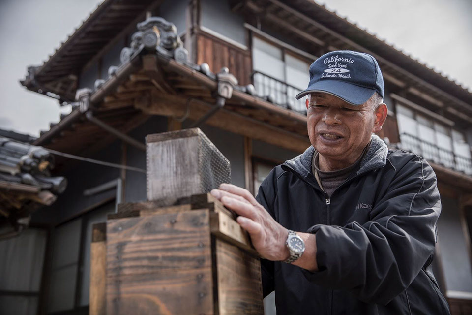 「ここまでに5回、やっと5回目に出来て、防ぐだけはできる。捕獲器の下は泥の中に埋(い)けるんです。この隙間がポイントなんじゃ。4分じゃから1センチ2ミリ。この隙間の寸法じゃなかったら、スズメバチは入ってこんのじゃ。1センチ5ミリに開けると、こんだ入ってきてもすぐ出るんです。入口から入ってきたスズメバチがどうしようかなと思った時に、上に上がるようにしておきます。奥行きは11センチぐらいのもんじゃな。ちょっと狭いぐらいの方が蜂は上へ行く習性がありますからな。捕獲器には6ミリの金網を張っとるんです。6ミリだと蜜蜂は出入りするし、スズメバチは抜けられないんです。これがポイントじゃな。スズメバチが入ってきてモゴモゴしよったら、ここに入ってきて出られんようになりますからな。これを考えて作ったんです。他所で売ってるもんでもないんです。巣箱は器用な人じゃったら出来ると思うんじゃけど、捕獲器はね、大工さんじゃなかったら考えられんことじゃろ。ここまで考える人はないだろうな。瓦職人だった祖父の名は嘉之平(かのへい)いうけど、父の英夫(あいお)は下駄職人、ぼくは指物大工で、代々職人の家なんです」