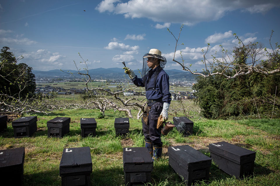 「果樹園」蜂場で仕事を終えた光信さんが交配用蜜蜂の巣箱を数える