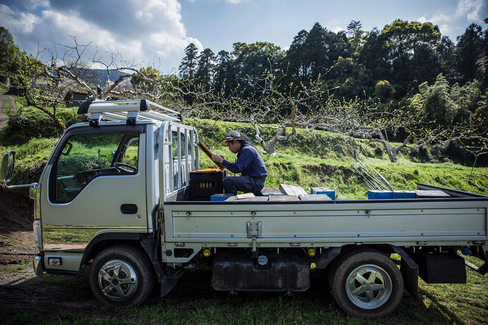 翌朝は、果樹園蜂場のさらに上にあり、光信さんが「本隊」と呼ぶ採蜜のための蜜蜂群がいる屋部蜂場の内検に向かった。2トントラック車幅で一杯になる柿畑の山道を、まるで乗用車を運転するように上っていく。山の中腹にある屋部蜂場も眼下にうきは市の市街地を見下ろす展望の良い場所だ。